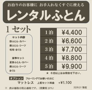 貸ふとん料金改定のお知らせ 2025年12月22日 最終更新日時 : 2025年12月22日 おじさん 2026年1月より貸ふとんの料金を改定させていただきます。 新料金はこちらです。 よろしくお願いいたします。